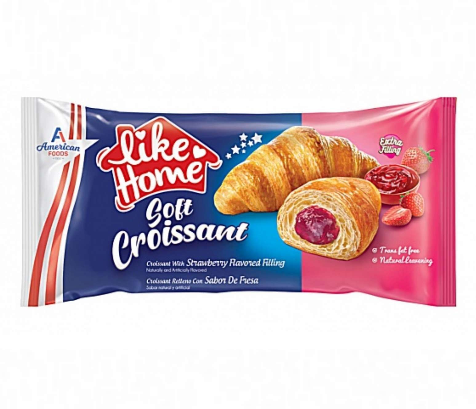 Like Home Soft Croissant Strawberry è il mix perfetto tra un croissant fresco e goloso ad un gustoso ripieno di fragole. Ogni morso ti regalerà un gusto in bocca davvero singolare. Provalo a colazione o come pausa dolce a scuola, a lavoro o durante una passeggiata.