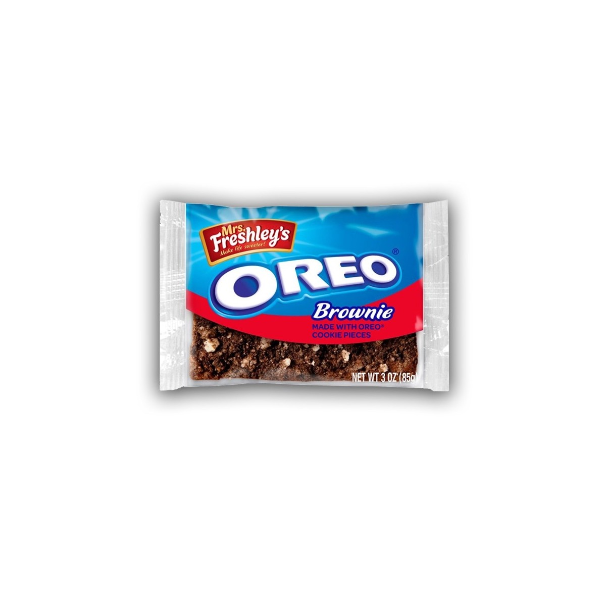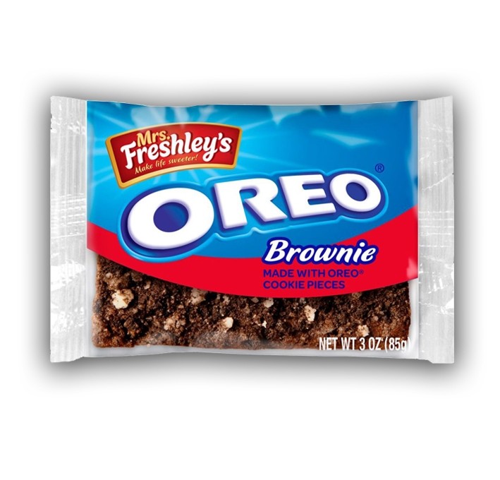 La mitica Bakery di Mrs. Freshley ci fa felici anche questa volta con l'Oreo Brownie più buono mai uscito. La caratteristica del brownie americano è di avere un intenso sapore di Cacao e di essere molto umido e burroso. Questo qui è proprio così e in più ha pezzettini di Oreo originali sbriciolati sopra e all'interno. In questo modo puoi beccare sia la crema alla vaniglia che il biscotto al cacao e sentirne distintamente il sapore. Prova i Mrs. Freshley's Oreo Brownie a colazione o a merenda e non vorrai mai più altro!
