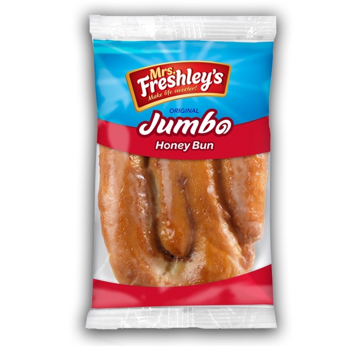 Uno dei più popolari dolci americani sono sicuramente le Honey Buns; delle ciambelline glassate al miele aromatizzate alla cannella di cui gli americani non possono fare a meno nelle loro ricche colazioni. Quella che vedi qui è la mitica Mrs. Freshley's Jumbo Honey Bun. Una ciambella più grande (ben 140 grammi) incartata singolarmente che ti farà leccare i baffi. Pur se confezionata come una comune merendina questa prelibatezza sembra in tutto e per tutto un prodotto da pasticceria! Lucida, morbida e fragrante renderà le tue giornate un po' più dolci.