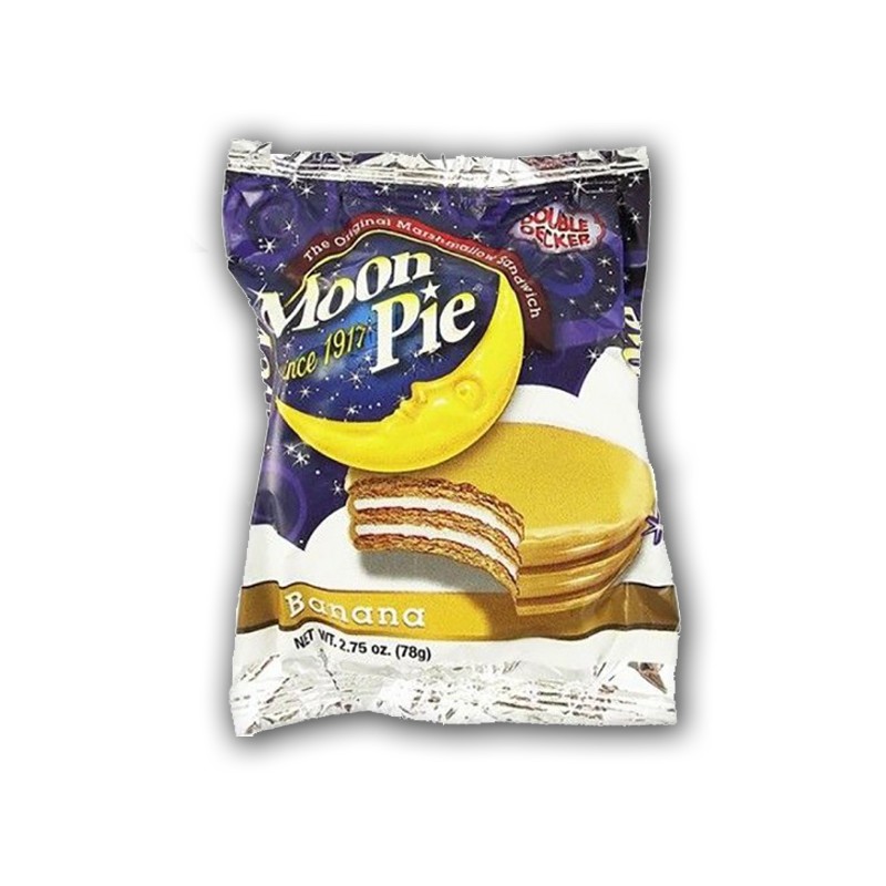 Dal 1917 Moon Pie regala emozioni agli americani e non. Forse questa è la merendina più conosciuta degli USA ed è diventato un simbolo tanto da ispirare tantissime canzoni e film. Questa golosissima tortina ha 2 strati di Graham Creckers ricoperti da una glassa al gusto di banana e ripieni di crema di Marshmallow. Eh si avete sentito bene e vi possiamo capire se già avete l'acquolina in bocca! Vi consigliamo vivamente di riscaldarla pochi secondi al microonde prima di gustarla...una goduria assoluta!