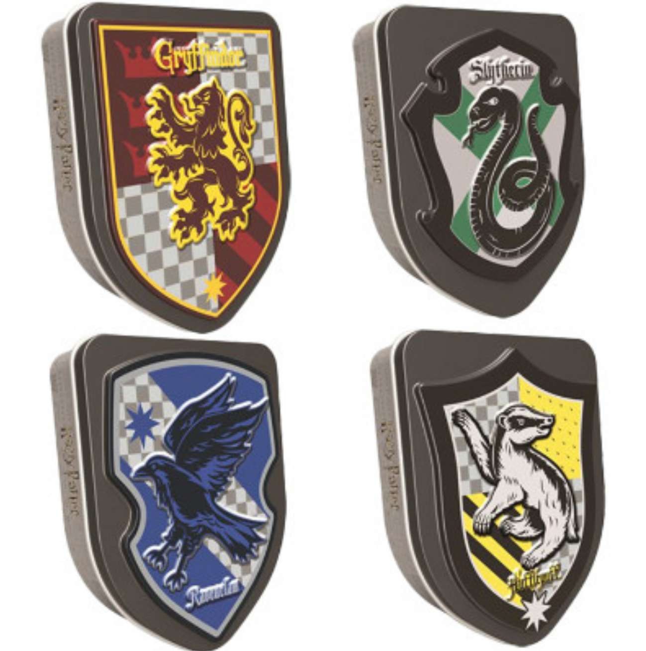 Scatole di caramelle Jelly Belly Beans con lo stemma delle Case della famosissima scuola di magia. Gli stemmi in metallo contengono le deliziose caramelle americane Jelly Belly: Grifondoro contiene delle caramelle alla ciliegia, Corvonero al gusto mirtillo, Tassorosso al limone e Serpeverde alla mela verde!