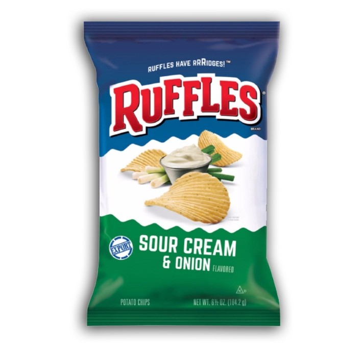 Ecco delle patatine davvero ricercate che gli americani amano alla follia. Le Ruffles sono un prodotto di qulità superiore che sapranno darti qualcosa in più rispetto alle comuni patatine che potresti trovare nei supermercati Italiani. Il gusto Sour Cream & Onion è un classico con il quale questa azienda ha fatto faville. Il gusto di panna acida si sposa benissimo con la dolcezza della cipolla; poi se parliamo della croccantezza tipica delle Ruffles completiamo il quadro di qualcosa di perfetto.