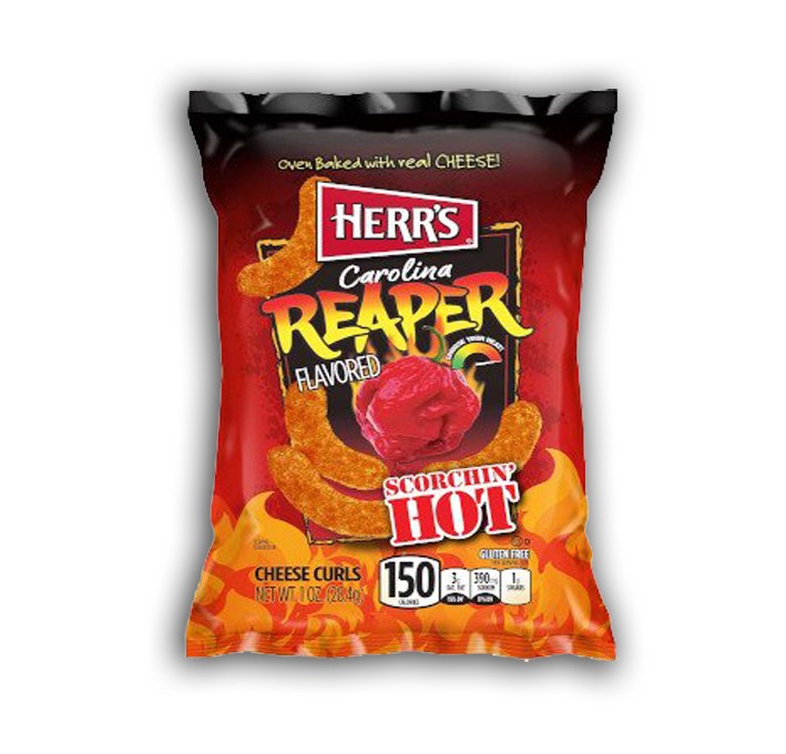 Attenzione: allarme piccantezza estrema attivato! Le Herr's Patatine al Formaggio e Peperoncino Carolina Reaper sono dei riccioli di mais al formaggio aromatizzati con polvere di Carolina Reaper. Attualmente il peperoncino Caroline Reaper è il più piccante al mondo con i suoi 2.200.000 sulla scala Scoville. Di conseguenza ti consigliamo di andarci piano perchè dopo le prime 3 o 4 patatine ti sembrerà di respirare fuoco! Queste patatine della Herr's sono quindi per i palati più temerari quindi ti consigliamo di andarci molto piano. Pacco piccolino da 28 grammi monoporzione. Gluten Free.