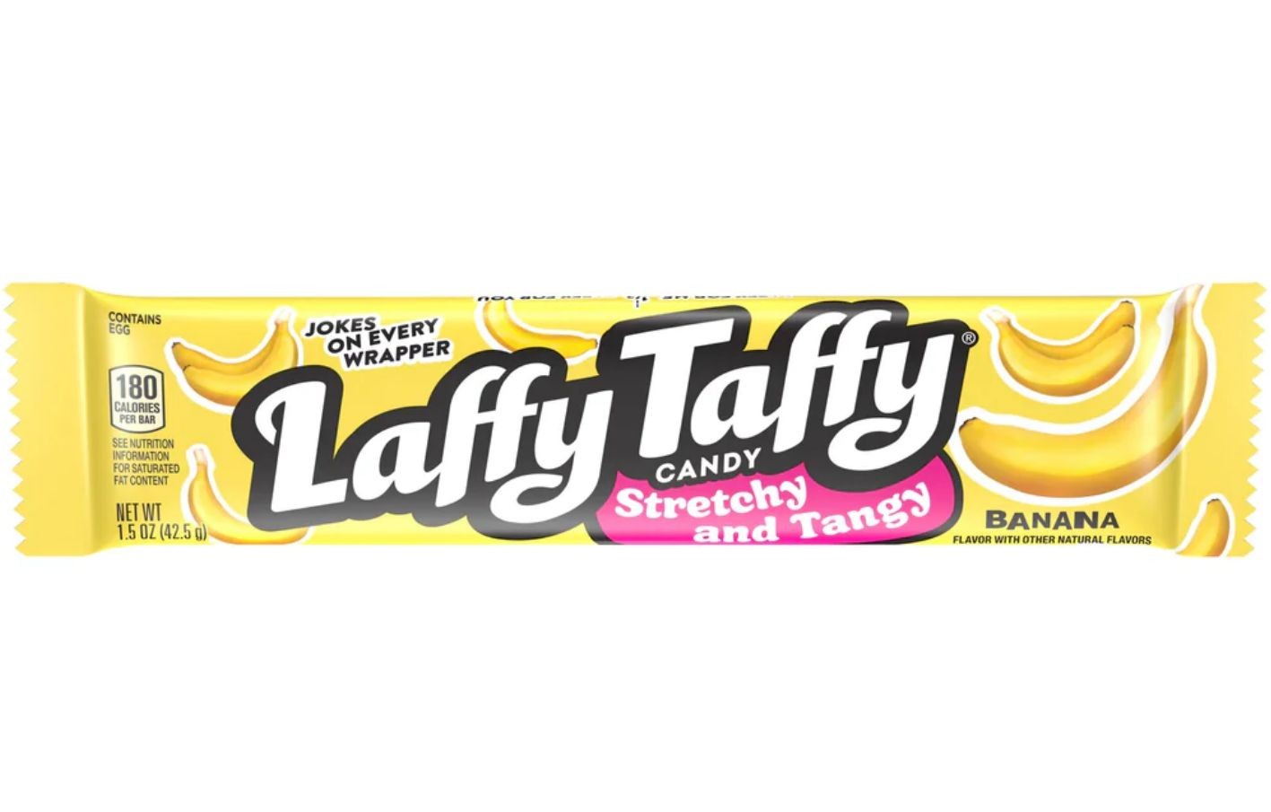 La nuovissima uscita di Laffy Taffy alla Banana ha una forma differente delle classiche Laffy Taffy lunghe e tubolari che conoscete. E' più corta e più schiacchiata anche se la caramella è quasi il doppio più grande (42.5 grammi contro 23 grammi). I bastoncini gommosi Laffy Taffy sono molto popolari tra i bambini americani, non solo per la forma allungata da poter deformare a piacimento, ma anche per la consistenza morbida ed elastica. Buona e succcosa la puoi allungare all'infinito! Puoi morderlo, masticarlo, girarlo, tirarlo… non importa come la mangi, non ti annoierai di certo!