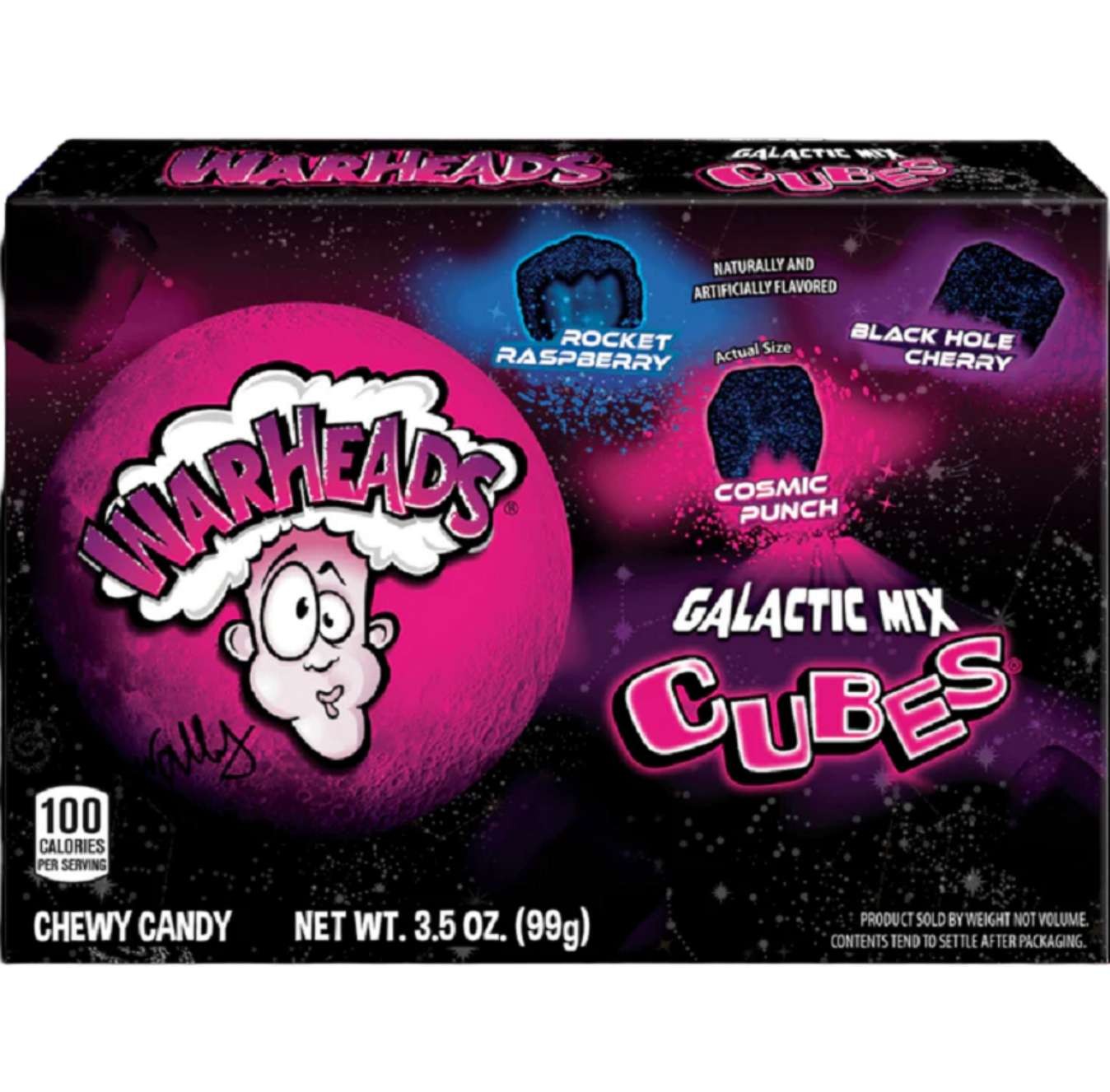 Fai un viaggio nello spazio più profondo con le Warheads Galactic Cubes! Queste caramelle "galattiche" ti trasporteranno letteralmente tra le galassie più lontane. Le caramelle si presentano come dei piccoli cubi di color antracite che, a prima vista, ti sembreranno tutti uguali. Invece al loro interno si nasconde un ripieno di diverso colore e gusto tra cui: rocket raspberry - lampone (che ti sparerà come un razzo nel buio dell'universo), black hole cherry - ciliegia (che ti farà entrare direttamente in un buco nero), cosmic punch - mix gusti fruttati (che ti farà galleggiare nello spazio cosmico). Prova questa esperienza grazie a Warheads Galactic cubes!