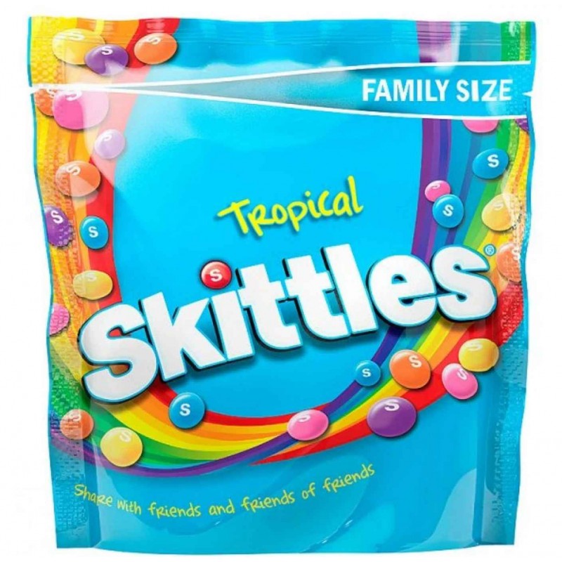 Se volete provare un'esplosione dentro la vostra bocca queste sono le caramelle che fanno al caso vostro. Nelle Skittles Tropical sono presenti tutti i gusti della frutta tropicale come Kiwi-Lime, Frutto della Passione-Ananas, Mango-Agrumi, Fragola-Carambola con un retrogusto pungente che vi farà innamorare. Divertitevi con Skittles!