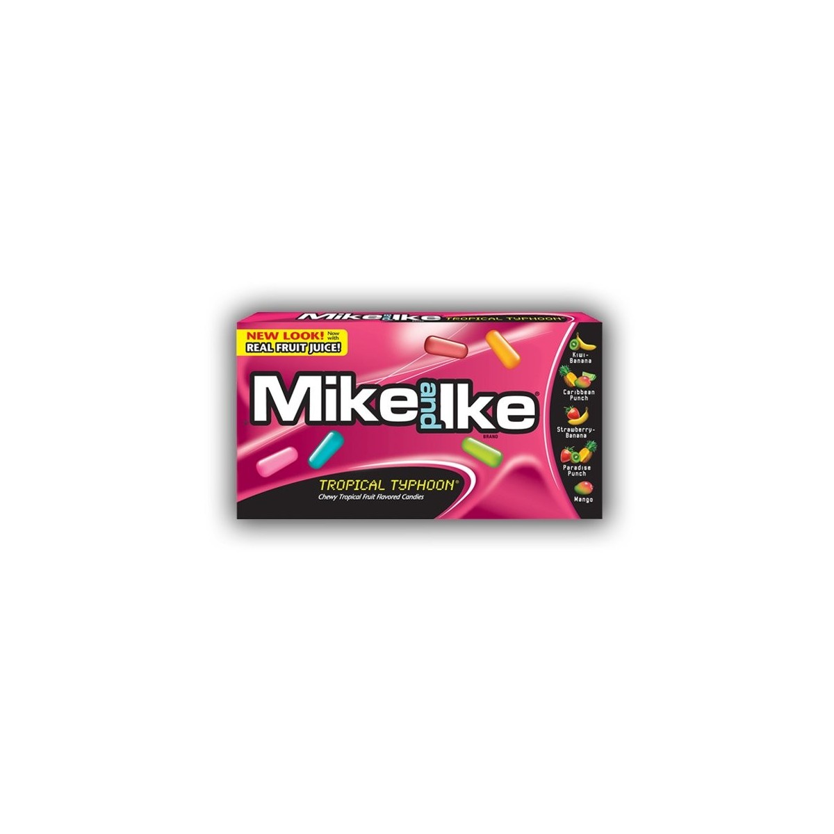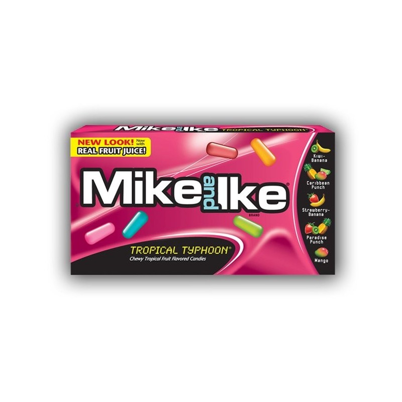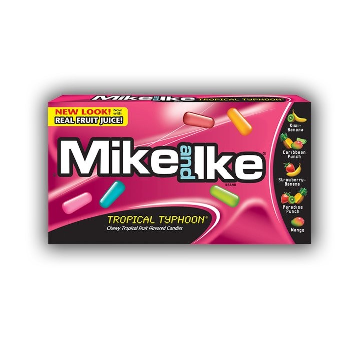 Le caramelle Mike & Ike, sin dal 1940, sono tra le più apprezzate dai bambini americani e non solo, perché tra i loro estimatori si contano nomi come Will Smith, Paul Rudd e Steven Spielberg. La la loro forma molto particolare a cilindretto o pillola le rendono uniche anche perché sono, come direbbero gli americani, "chewy" che letteralmente vuol dire masticose ed hanno un sapore di frutta molto intenso e gradevole. Prova il gusto Tropical Typhoon, che vuol dire tifone tropicale. Ti sembrerà di ritrovarti in un paese tropicale con i gusti: kiwi/banana, cocktail caraibico, fragola/banana, paradise punch e mango.