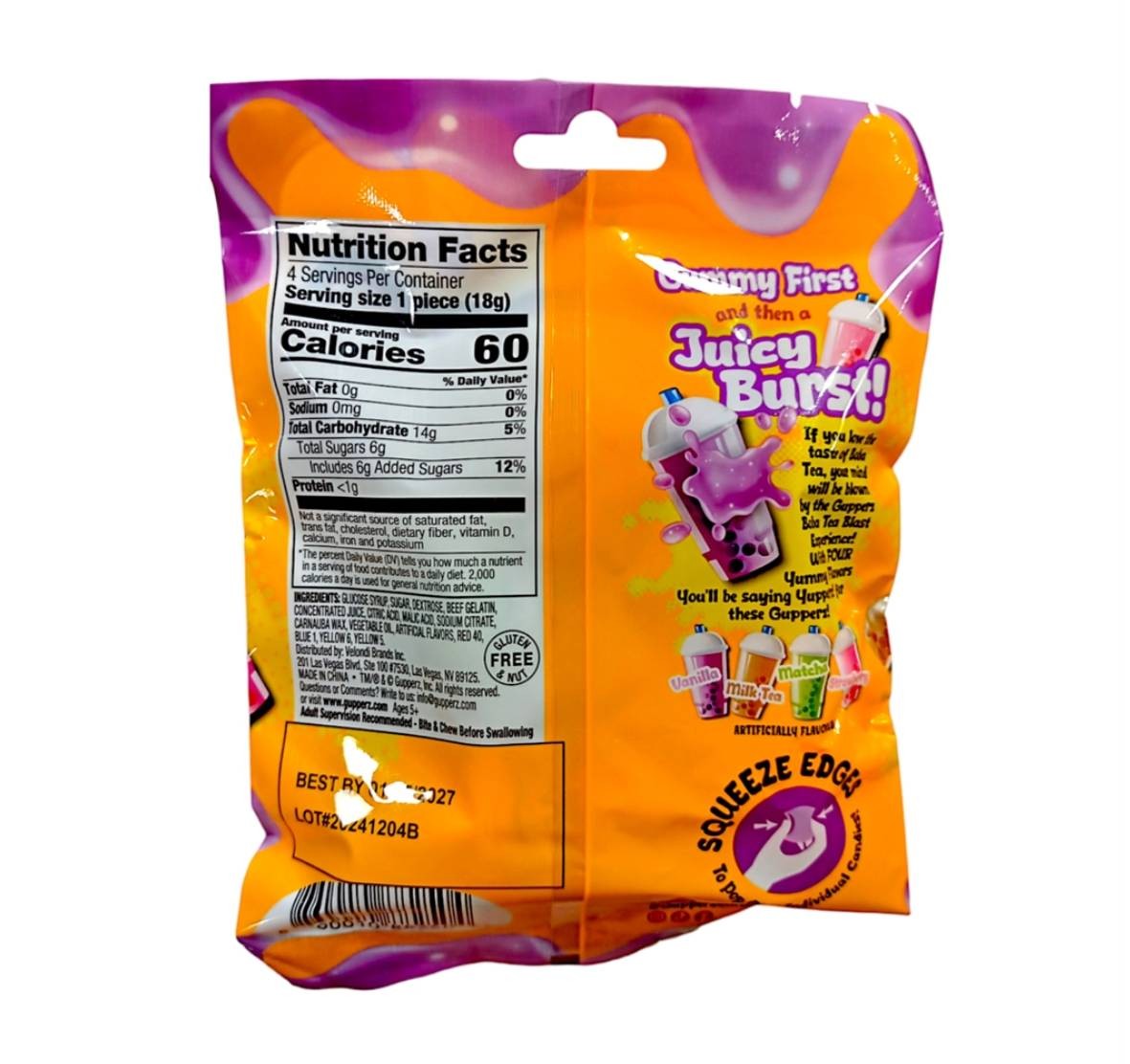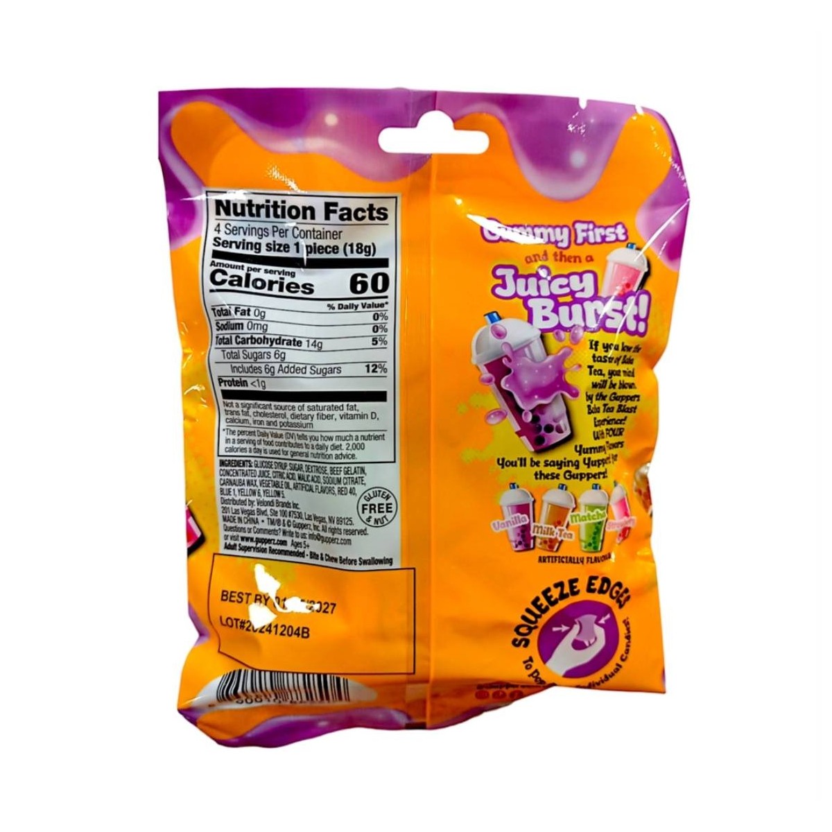 Gupperz Boba Tea Blast– L'esplosione di gusto in formato snack! Scopri Gupperz Boba Tea Blast 2.54oz, la rivoluzionaria caramella che unisce il sapore avvolgente del bubble tea con la praticità di uno snack tascabile! Ogni confezione racchiude piccole sfere gelatinose dal cuore liquido, pronte a scoppiare in bocca rilasciando tutto l'aroma e la dolcezza tipici del famoso tè con perle. Una delizia originale e rinfrescante, senza bisogno di shaker o cannucce giganti!
