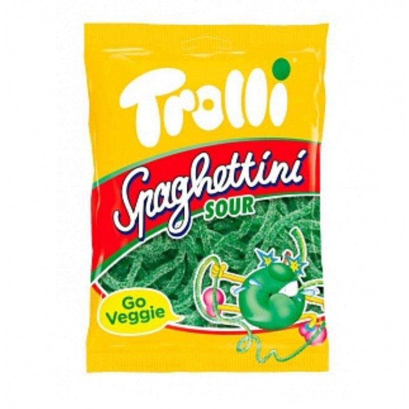 Divertimento frizzante dei Trolli Spaghettini Sour Apple: deliziosi fili gommosi al gusto di mela verde, dal mix perfetto di dolcezza e acidità.