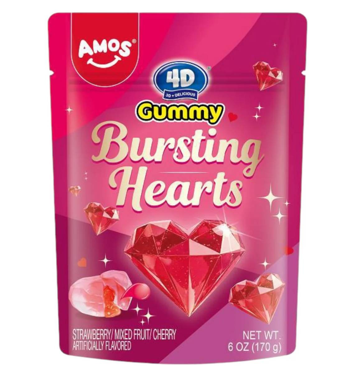 Amos 4D Bursting Hearts sono caramelle gommose a forma di cuore dall'aspetto realistico, pensate per sorprendere già al primo sguardo. La consistenza morbida ed elastica racchiude un ripieno liquido dal gusto intenso che si sprigiona al morso, creando un piacevole contrasto tra dolcezza e freschezza. Ideali come snack goloso o da condividere, rappresentano una scelta originale per chi cerca una caramella diversa dal solito, capace di unire estetica curata e un'esperienza di gusto coinvolgente in ogni momento della giornata.