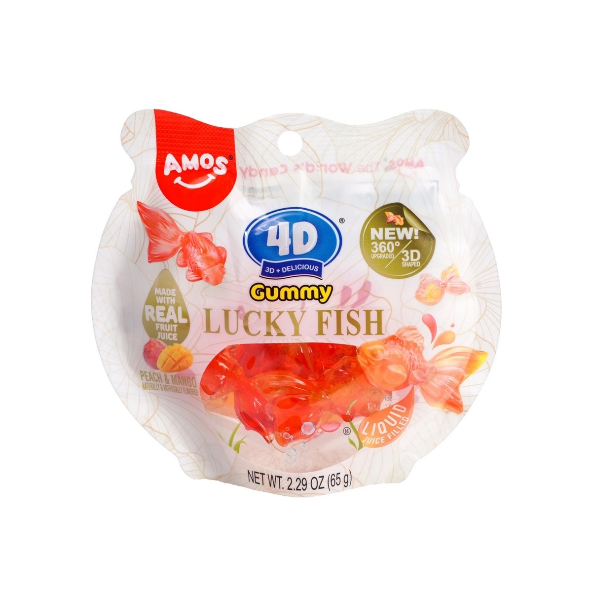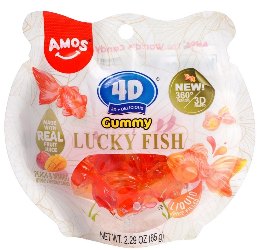 Amos 4D Gummy Lucky Fish è una confezione di caramelle gommose da 60 g a forma di piccoli pesci, con sapori fruttati come pesca e mango che offrono un gusto dolce e tropicale. La texture morbida e la forma originale rendono queste gomme uno snack divertente e piacevole da masticare, ideale per chi cerca un dolce dal design giocoso e un sapore fruttato intenso in un formato pratico da portare con sé.
