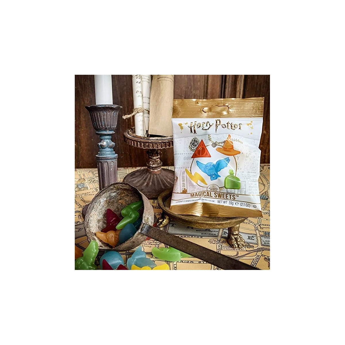 Benvenuto alla scuola di magia di Hogwars! Per diventare un maghetto in piena regola tutto il necessario che devi avere è contenuto nella Jelly Belly Harry Potter Busta Simboli Gommosi. Dentro infatti trovi tante piccole delizie a forma di Bottiglietta delle pozioni (anguria), Civetta Edvidge (frutti di bosco), Cappello Parlante (mandarino), Cicatrice a forma di Saetta (banana), Doni della Morte (ciliegia aspra).