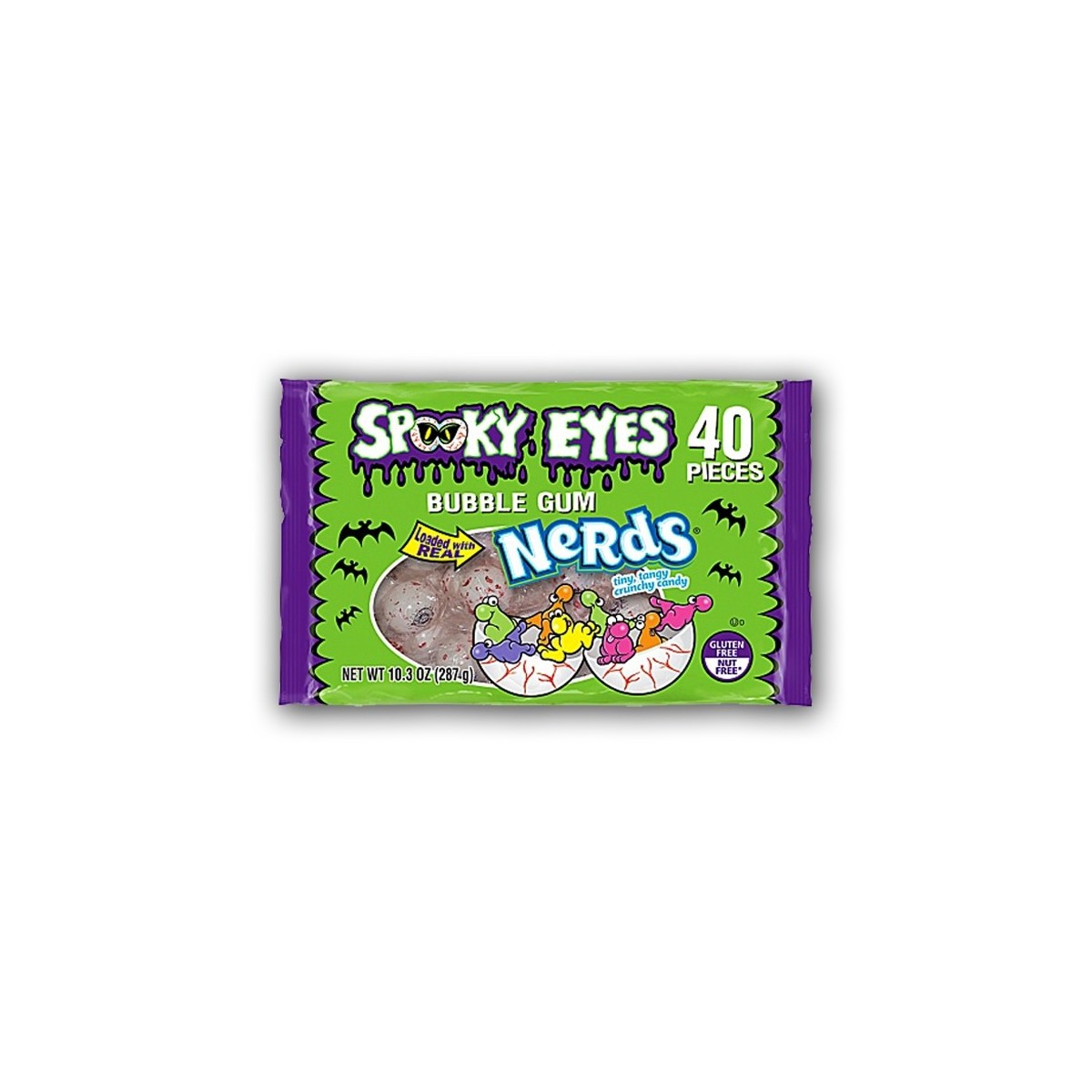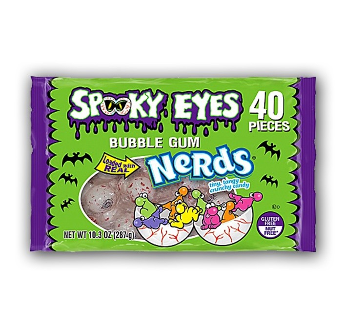 Lo spirito di Willy Wonka è pronto per tormentarti per tutta la festa di Halloween con queste gomme da masticare a forma di globo oculare della Nerds. Si tratta di un dolcetto o di uno scherzetto? Entrambi cari miei! Dentro questi chewing gum orribili si nasconde un segreto: un cuore ripieno di mini caramelline Nerds! E come se non bastasse faranno la loro bella figura per decorare la tua festa di Halloween. Questo pacco di Nerds Bulbi Oculari Bubble Gum è veramente gigente (ben 367 grammi) per un totale di 40 caramelle.