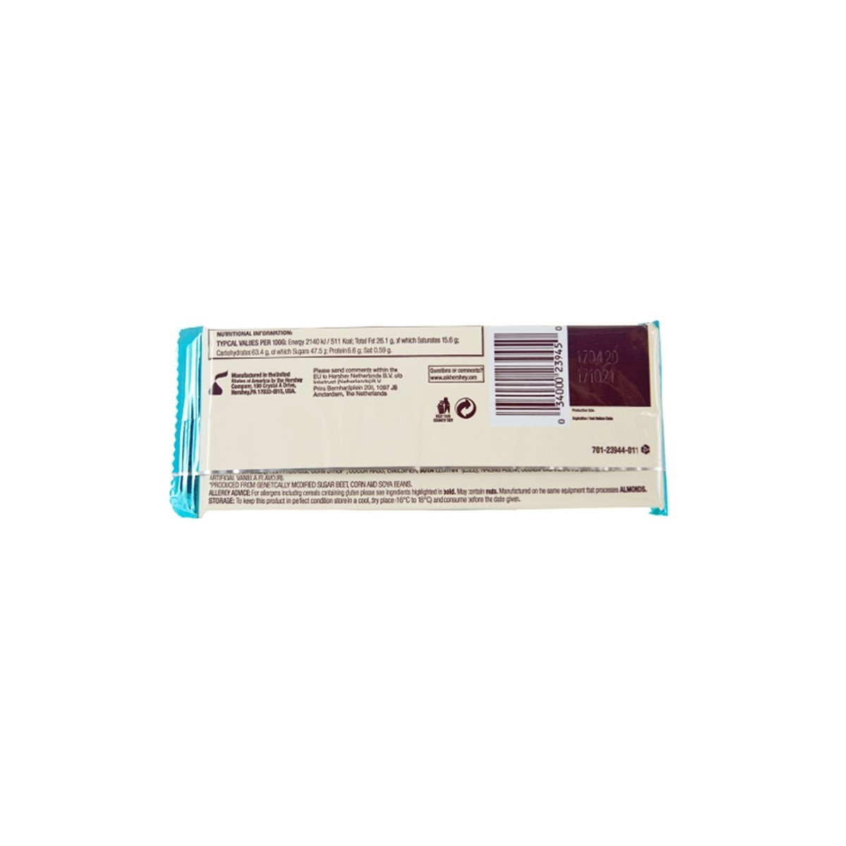 Ingredienti: Zucchero, oli vegetali (burro di cacao, palma, karitè e / o cartamo), latte scremato , solidi di sciroppo di mais, farina di frumento arricchita (farina, solfato ferroso [ferro], vitamine B3-B1-B2-B9), grasso di latte , parzialmente oli vegetali idrogenati ( soia e / o semi di cotone), 2% o meno di: cacao lavorato con alcali, siero di latte ( latte ), cioccolato, emulsionanti E476-E322 ( lecitina di soia), sciroppo di mais ad alto fruttosio, regolatore di acidità E500ii, sale, naturale e aromi artificiali, antiossidante E307 (vitamina E) per preservare la freschezza, colore E150. Prodotto in uno stabilimento che lavora anche mandorle. Contiene OGM.