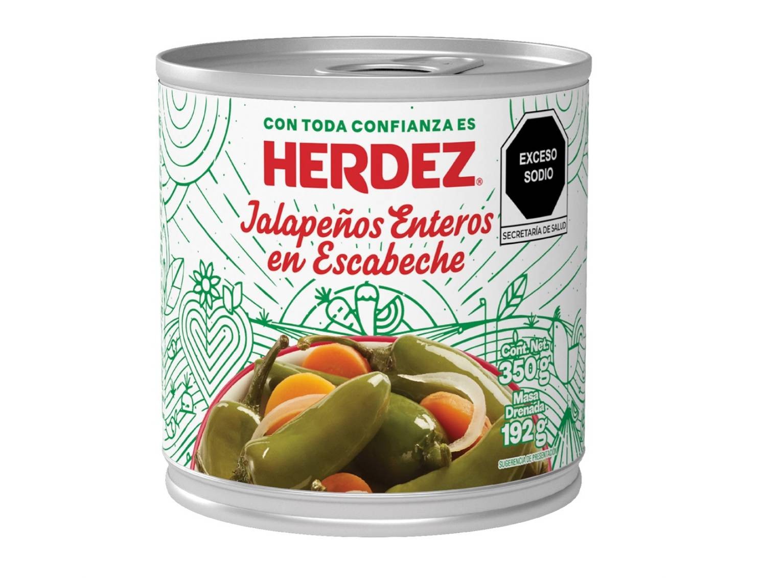 Ingredienti: Peperoncini jalapeno 45%, acqua, aceto di canna da zucchero, escabeche 6%: carote, cipolla, spezie, olio vegetale; Sale iodato, aglio in polvere, cloruro di calcio. Conservare in un luogo fresco e asciutto. Dopo l'apertura versare in un contenitore idoneo, conservare in frigorifero e consumare il più presto possibile.
