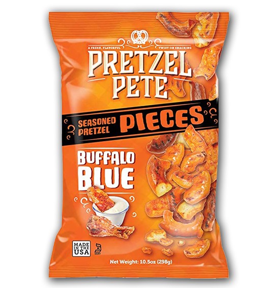 Ingredienti: Pretzel (farina di grano invernale, lievito e bicarbonato di sodio), olio di canola pressato non OGM, aroma di salsa buffalo [maltodestrina, salsa piccante (pepe di cayenna, aceto distillato, sale, aglio in polvere), aglio in polvere, sale, aceto, zucchero, formaggio gorgonzola (latte pastorizzato, colture, sale, enzimi), latte magro, aromi naturali, acido citrico, aromi di burro naturale (burro, burro dolce, aromi naturali), estratti di paprika, annatto e curcuma].
